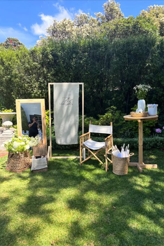 A simple seating area, a mirror, and a small refreshment station instantly make the gathering feel considered.