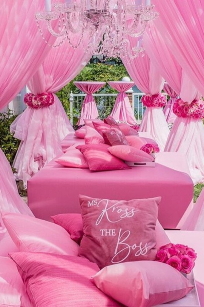 Low seating, plush textures, and a cohesive color story turn the gathering into an experience rather than just a party.