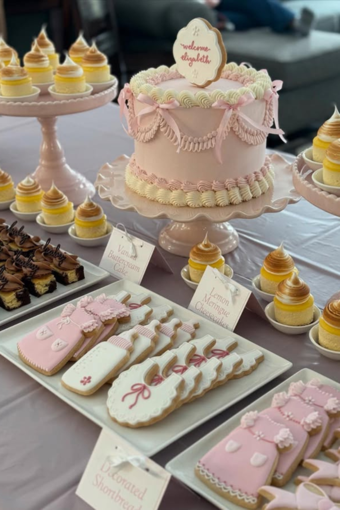 If dessert is the emotional centerpiece of your brunch baby shower, give it a moment of its own.