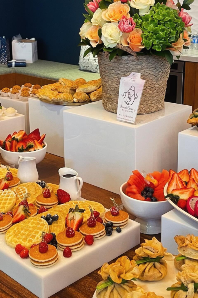 Mini pancakes, waffles, fruit, and pastries invite guests to take a little of everything without committing to a full plate.