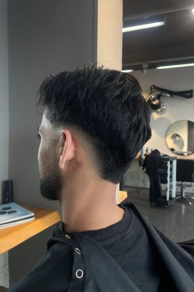 Natural flow matters more than sharp contrast here. The fade hugs the ear and melts into the back and keeping the haircut calm and balanced.