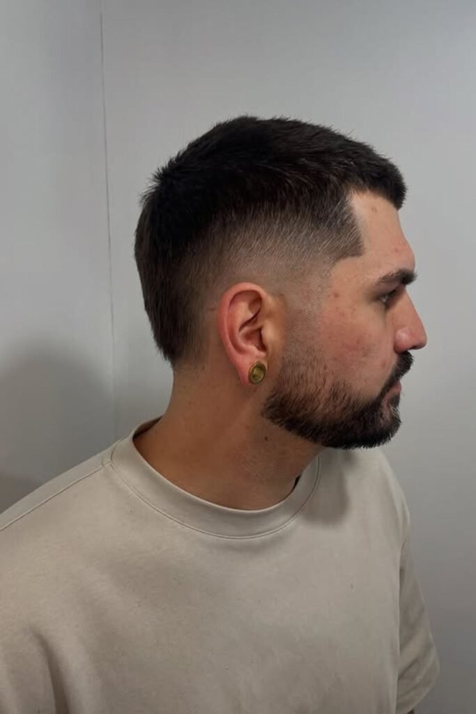 Short hair doesn’t mean boring if the fade is placed right. The tight crop on top keeps everything low effort.