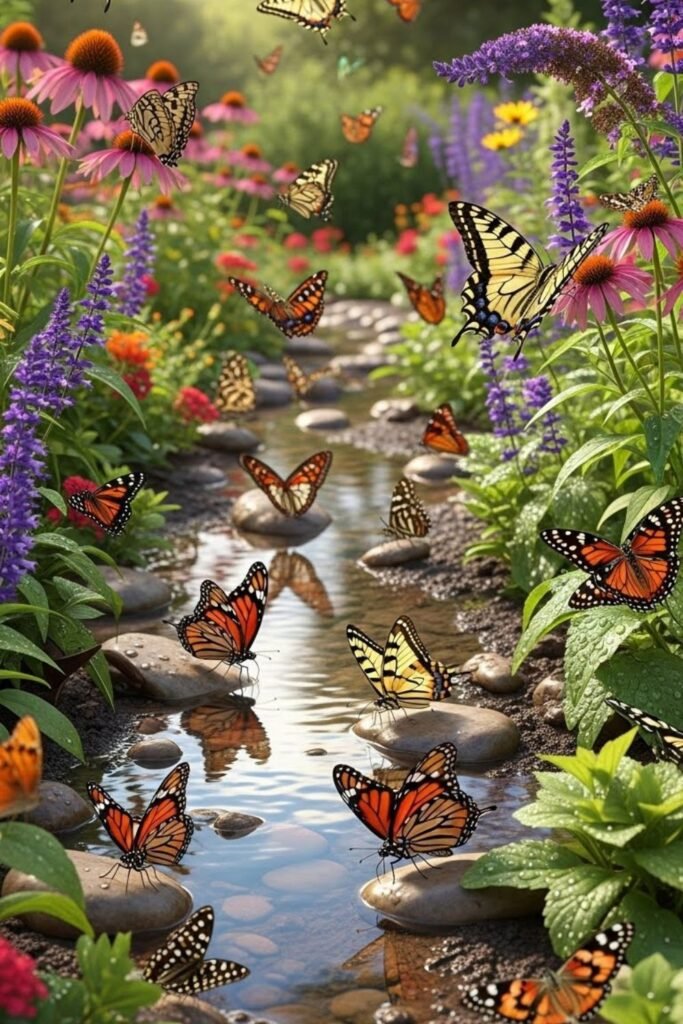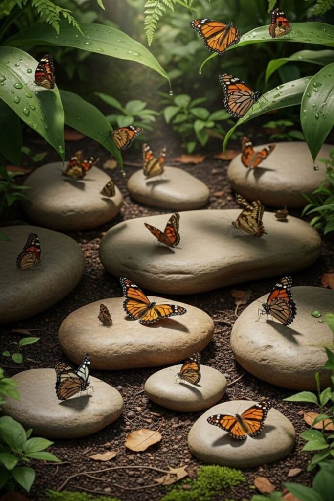 Thirst keeps butterflies searching longer than hunger sometimes, so I add shallow water spots. I use damp soil, sand, or flat dishes placed in safe areas.