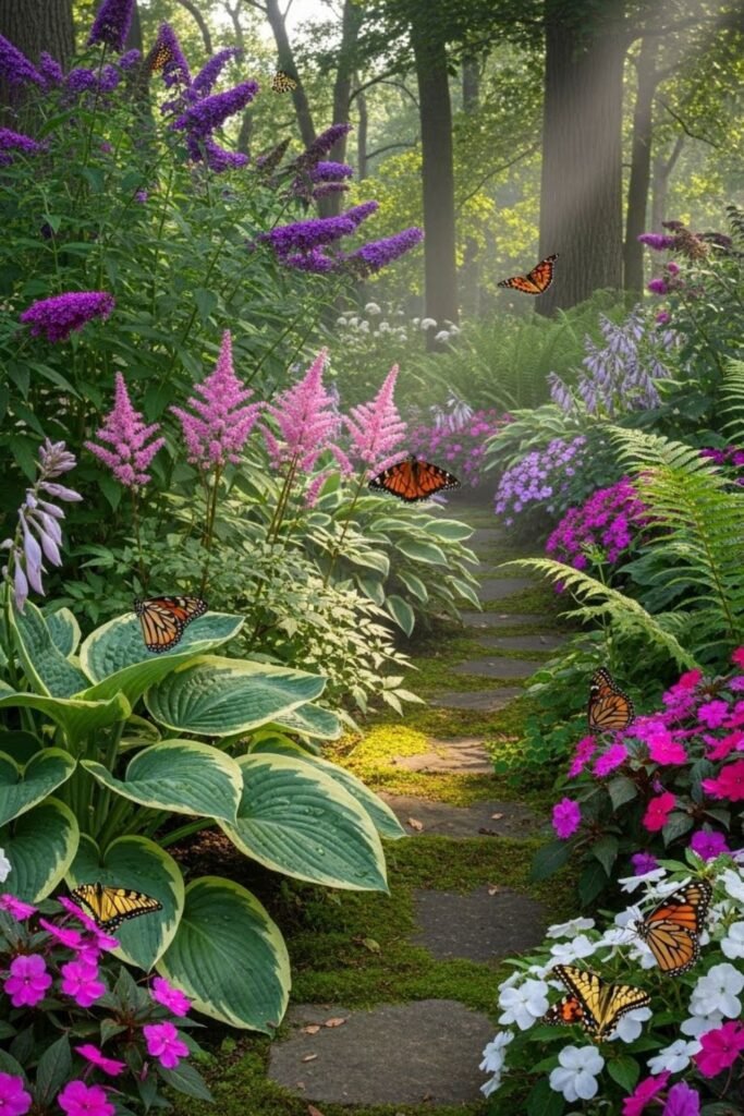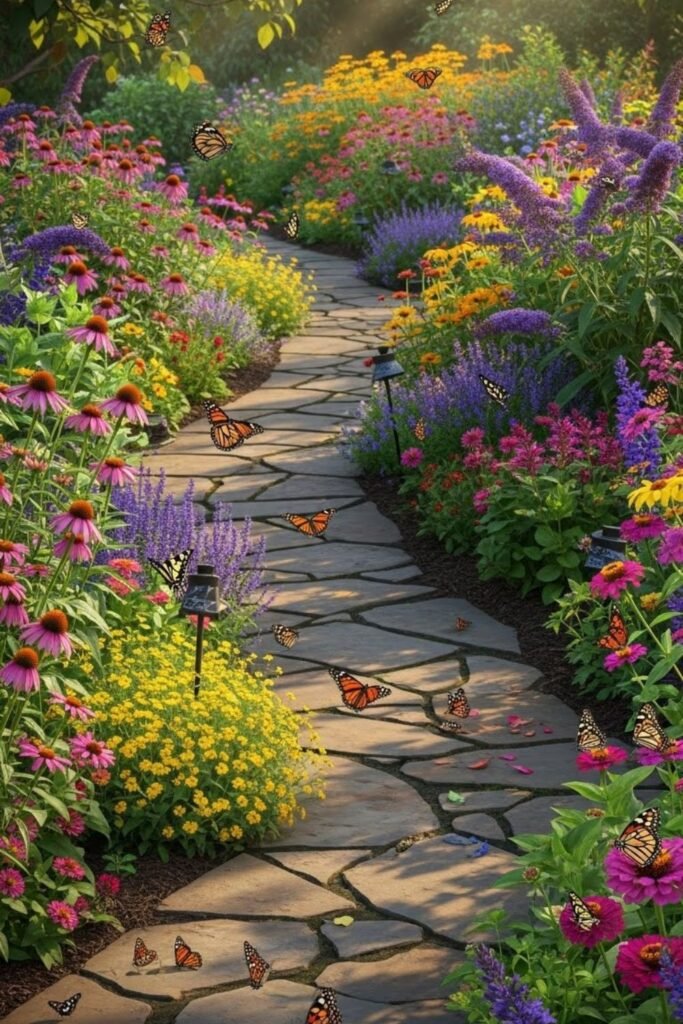 Walking through butterflies changes how the garden feels, so I design paths with intention. I place plants on both sides, close enough for wings to brush past without damage.