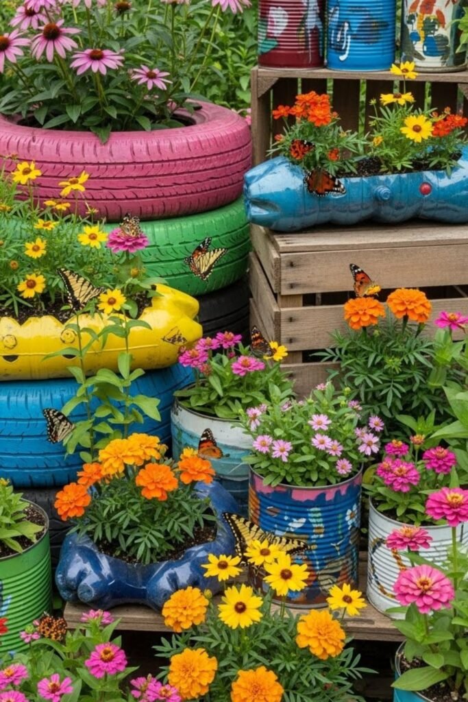Old containers deserve another chance, so I reuse what I already have. Buckets, tins, and worn planters become butterfly homes with drainage added.