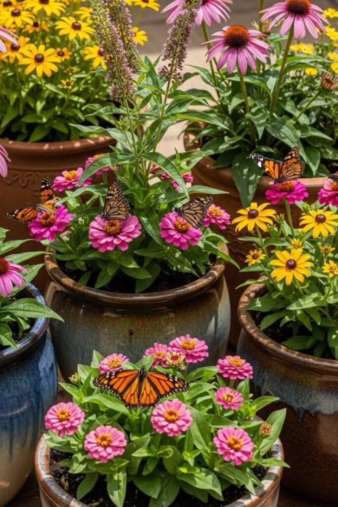 Pots work better than single planters when you group them tightly. I cluster containers so butterflies don’t waste energy flying far between meals.