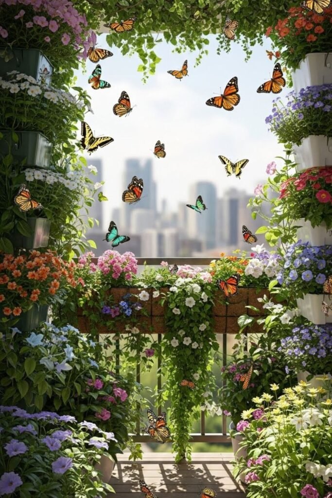 Limited floor space doesn’t stop butterflies if you grow upward. I use wall planters and hanging baskets to lift nectar plants into flight paths.