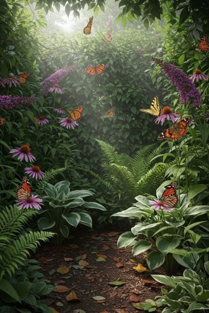 Unused corners often get ignored, so I turn them into quiet butterfly zones. I fill the space with layered plants.