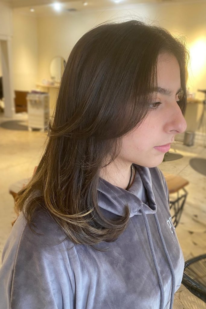 These layers begin at the collarbone, creating a subtle yet voluminous effect that highlights the hair’s natural shine.