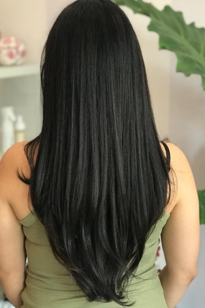 Its rich, deep midnight black hue elevates the overall refinement of the cut. Ideal for those with long, smooth hair, the style begins with layers just beneath the shoulders.