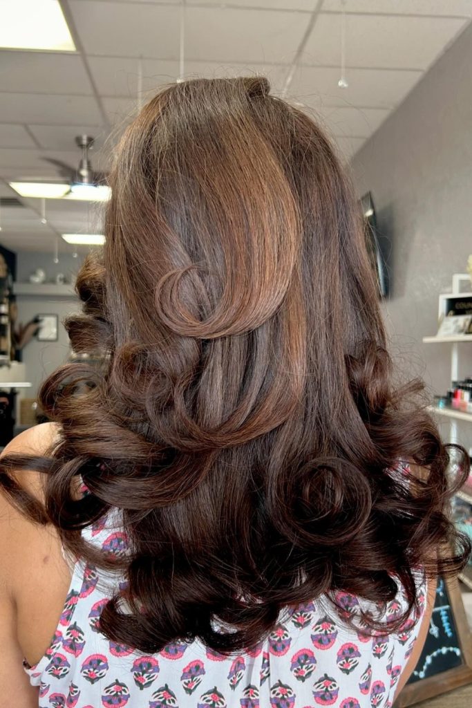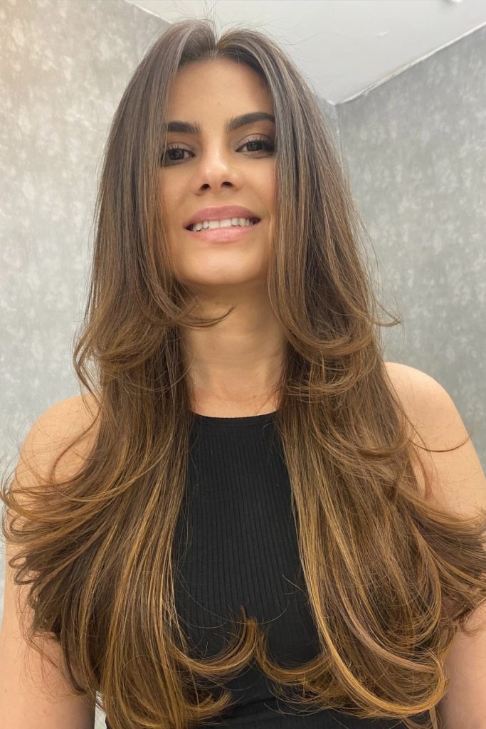 To achieve this look, ask for long, layered waves that preserve the hair’s natural flow. The warm tones provide a luminous finish.