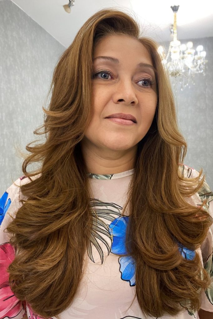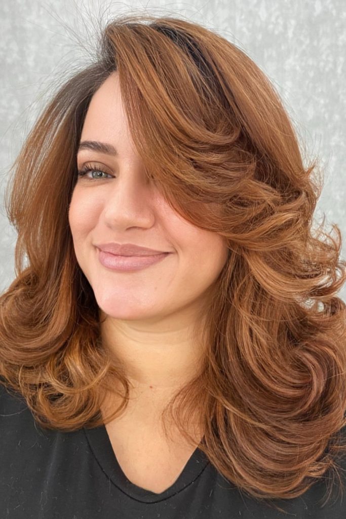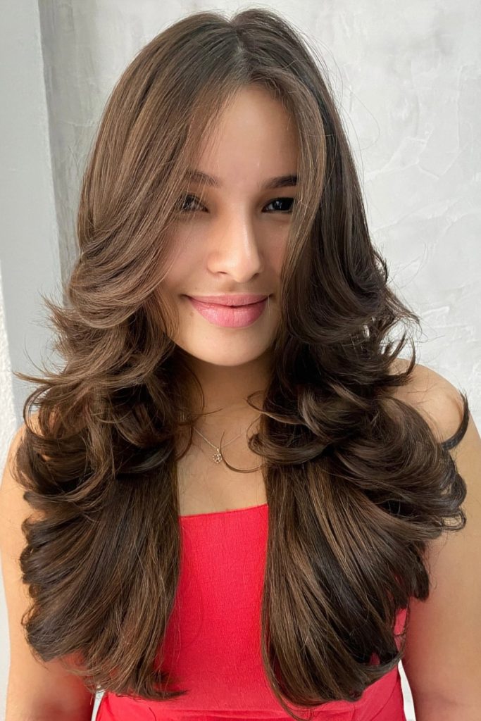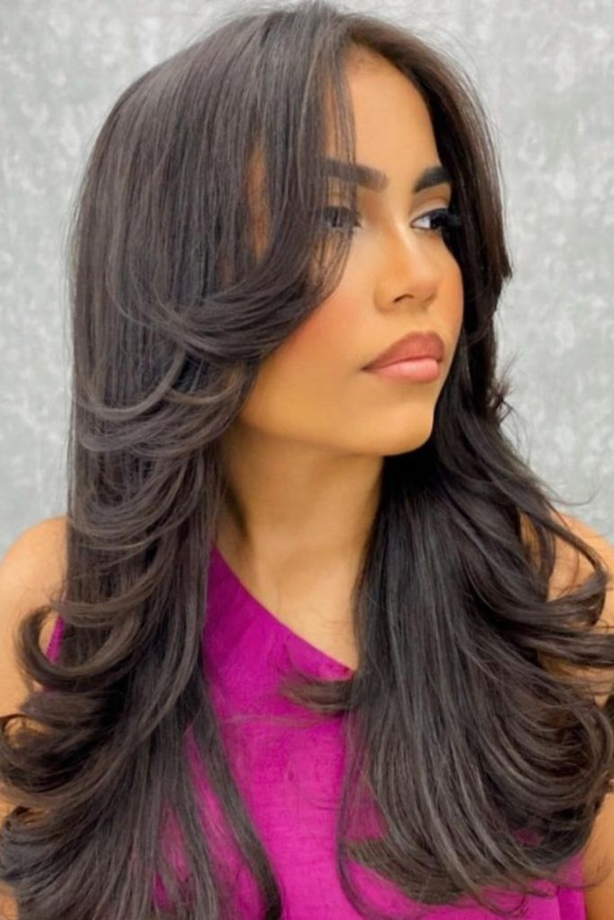 This hairstyle boasts voluminous, sweeping layers that gracefully cascade from the crown, creating a mesmerizing wave effect.