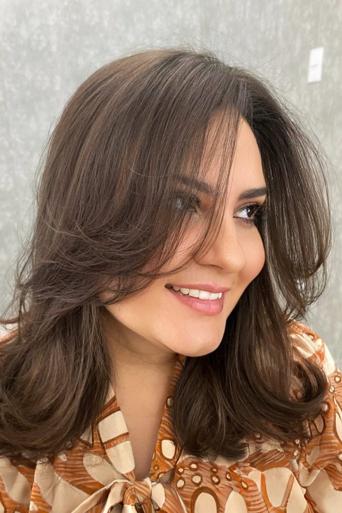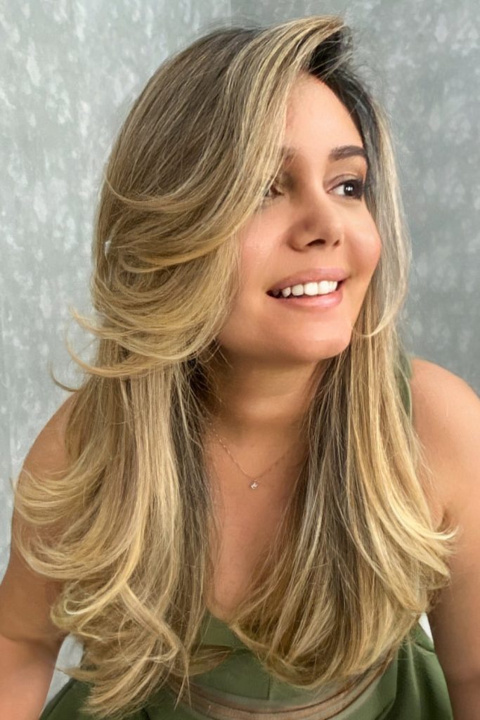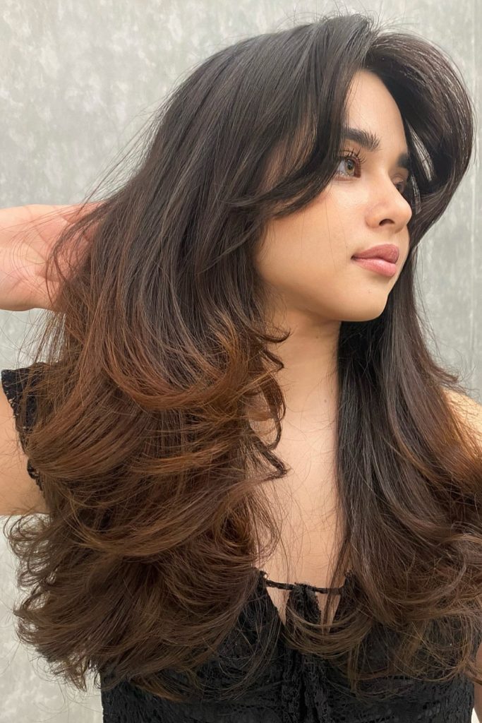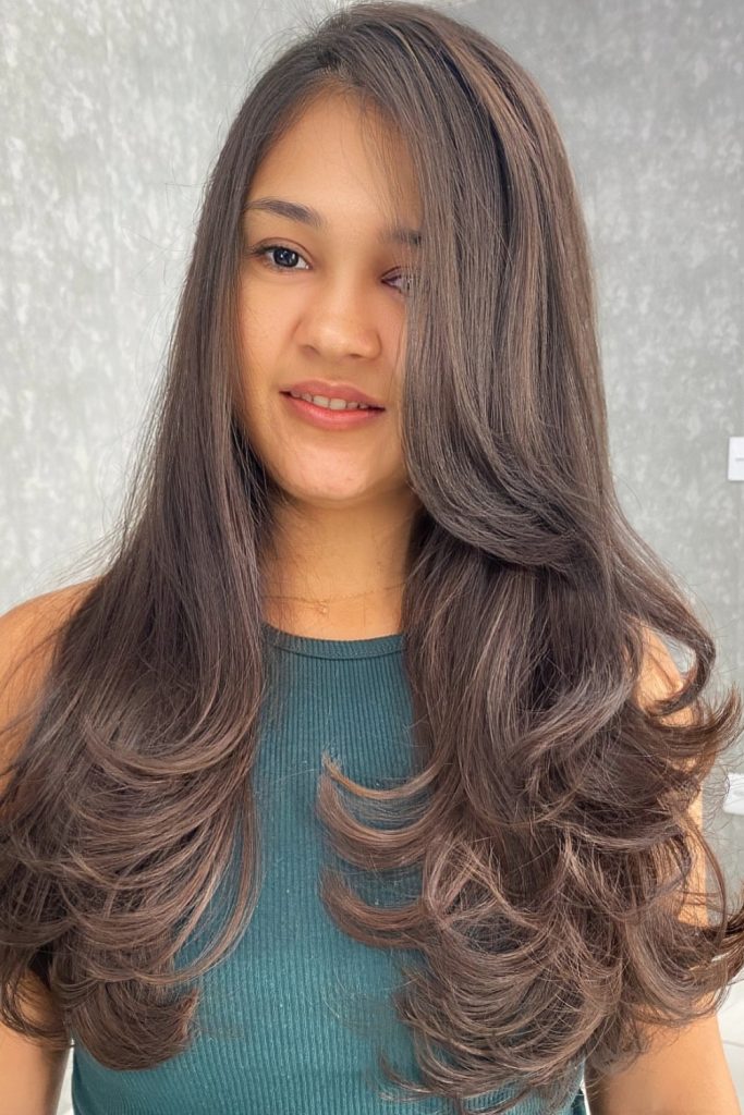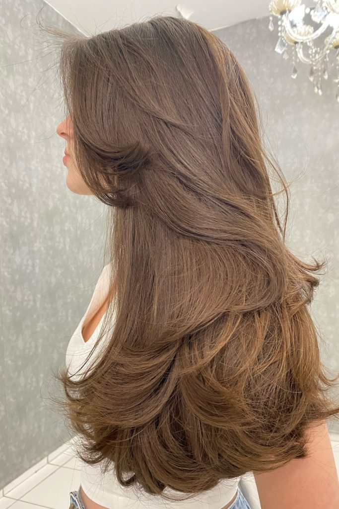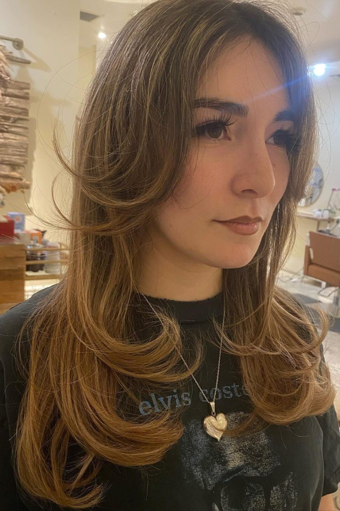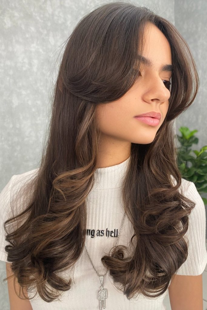 To achieve this look, request long, feathered layers that begin around the cheekbones, allowing them to cascade smoothly.