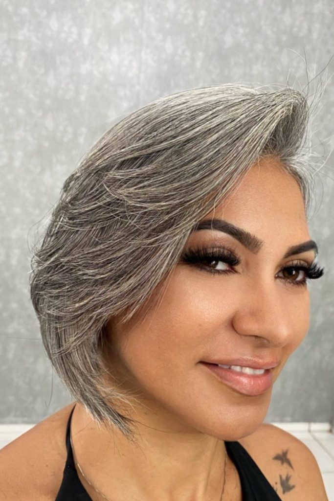 This chic butterfly bob is all about bold style, with sleek silver layers sculpted into a modern, angular silhouette.