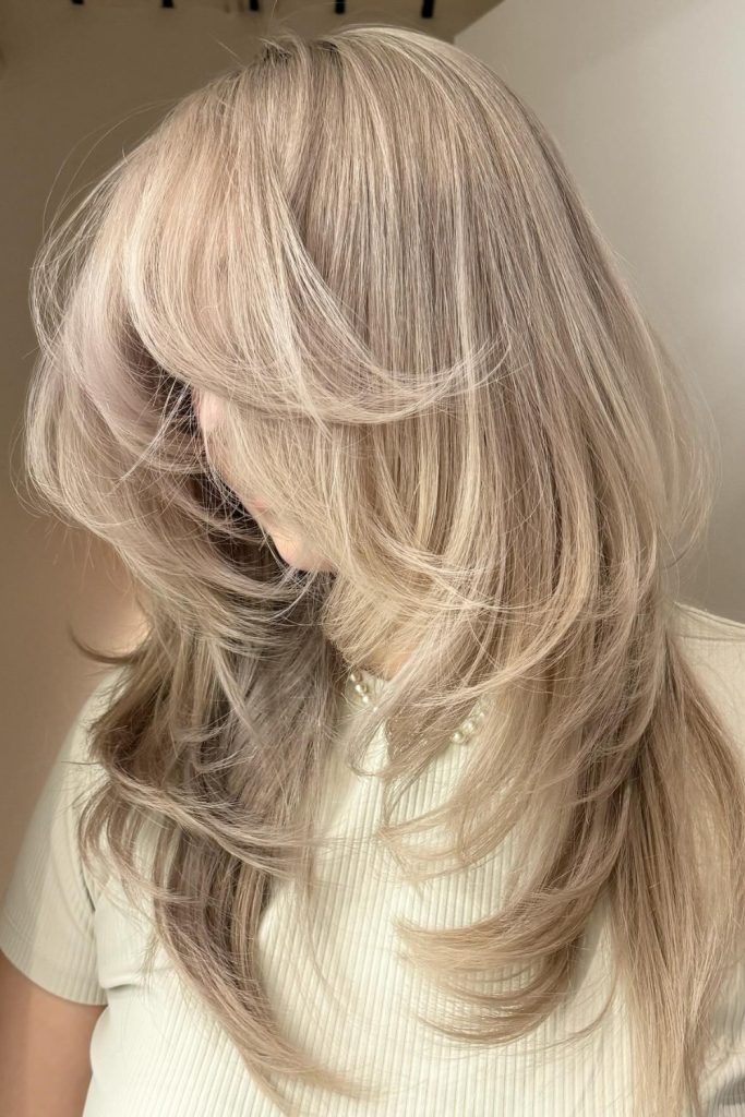 The Feathered Platinum Sweep is a sophisticated and contemporary butterfly hairstyle, known for its gentle, flowing layers. The light platinum hue enhances the ethereal, feathered effect of the cut.