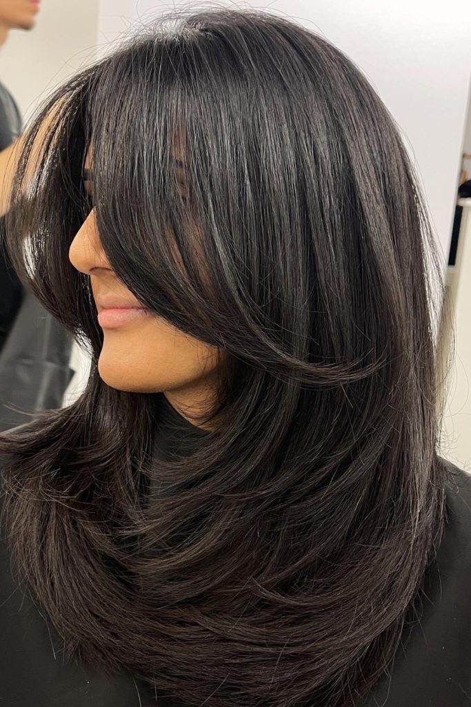 This style is ideal for thick hair, this cut manages volume while maintaining a polished, elegant look. The deep espresso hue adds a dramatic flair, making it a daring and stylish option.