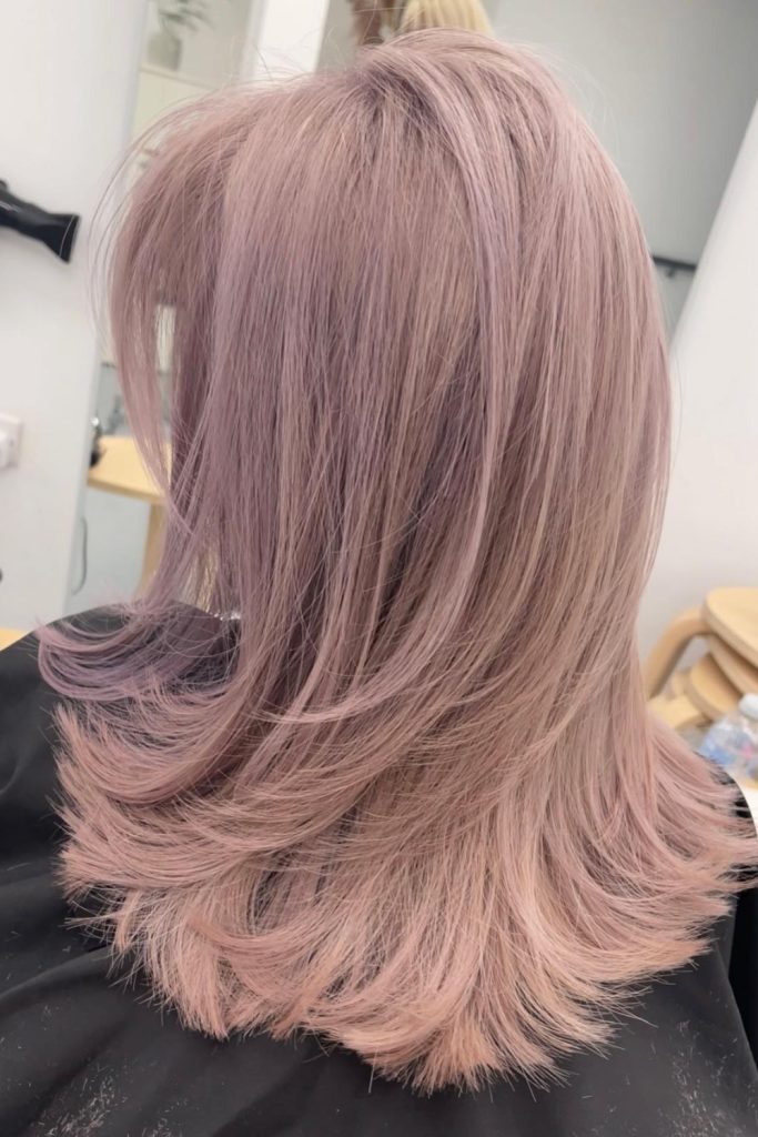 To recreate this style, ask for medium-length layers with a gentle inward curl at the tips. This color choice introduces a trendy, whimsical flair to the timeless butterfly silhouette.