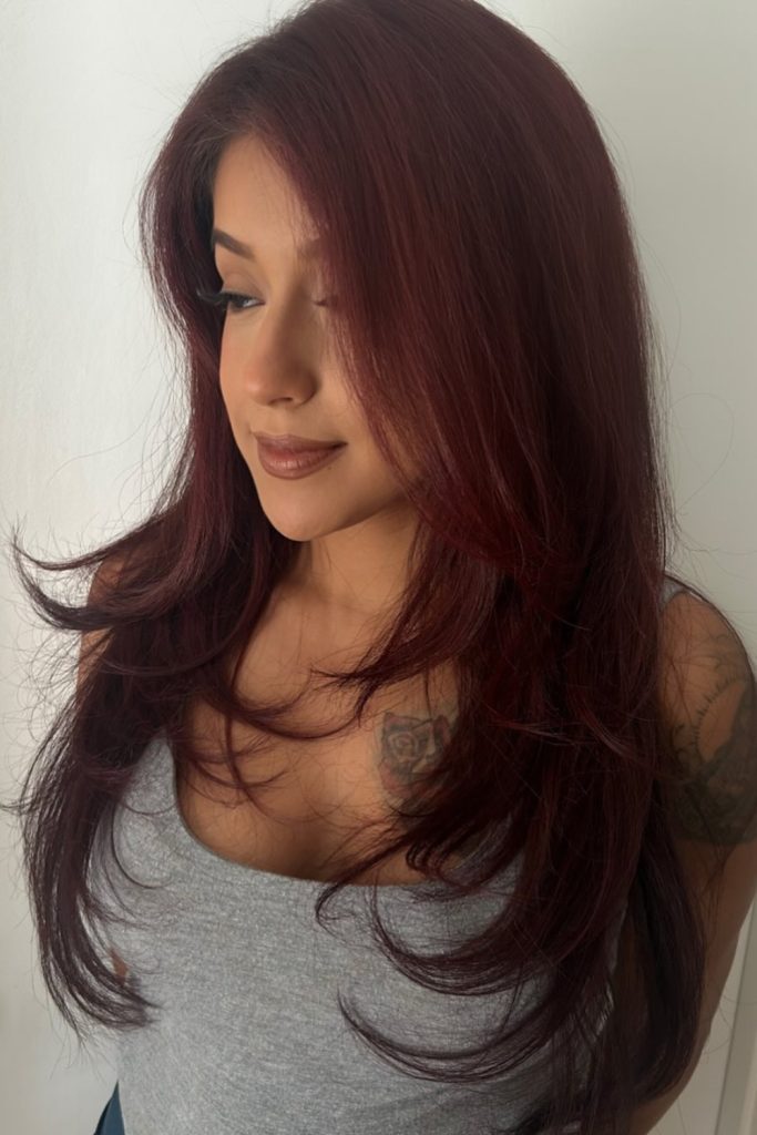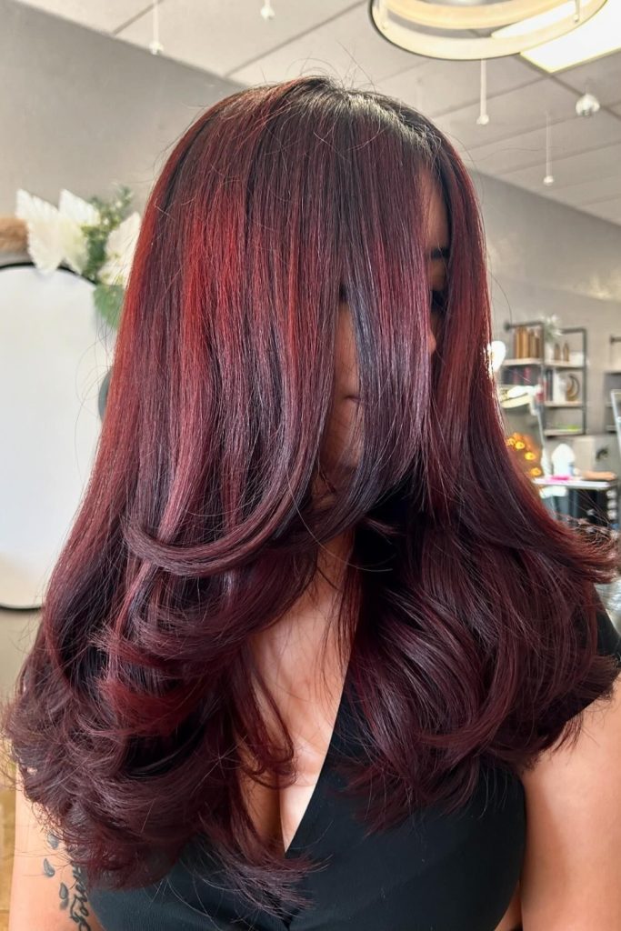 This striking hairstyle showcases deep crimson hues cascading through the layers, creating depth and dimension in the butterfly cut.