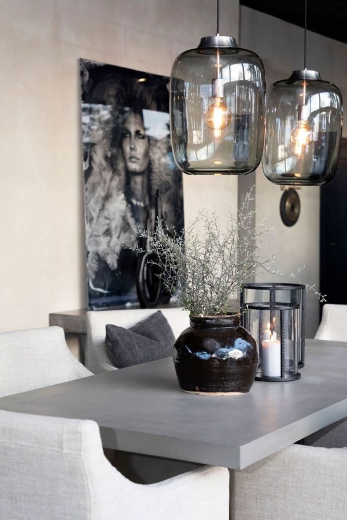 Lighting over a dining table should feel intentional, not random. Double smoked-glass pendants instantly create focus and mood without needing a huge chandelier.