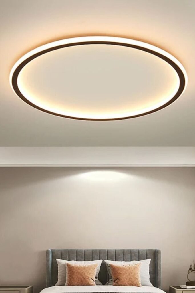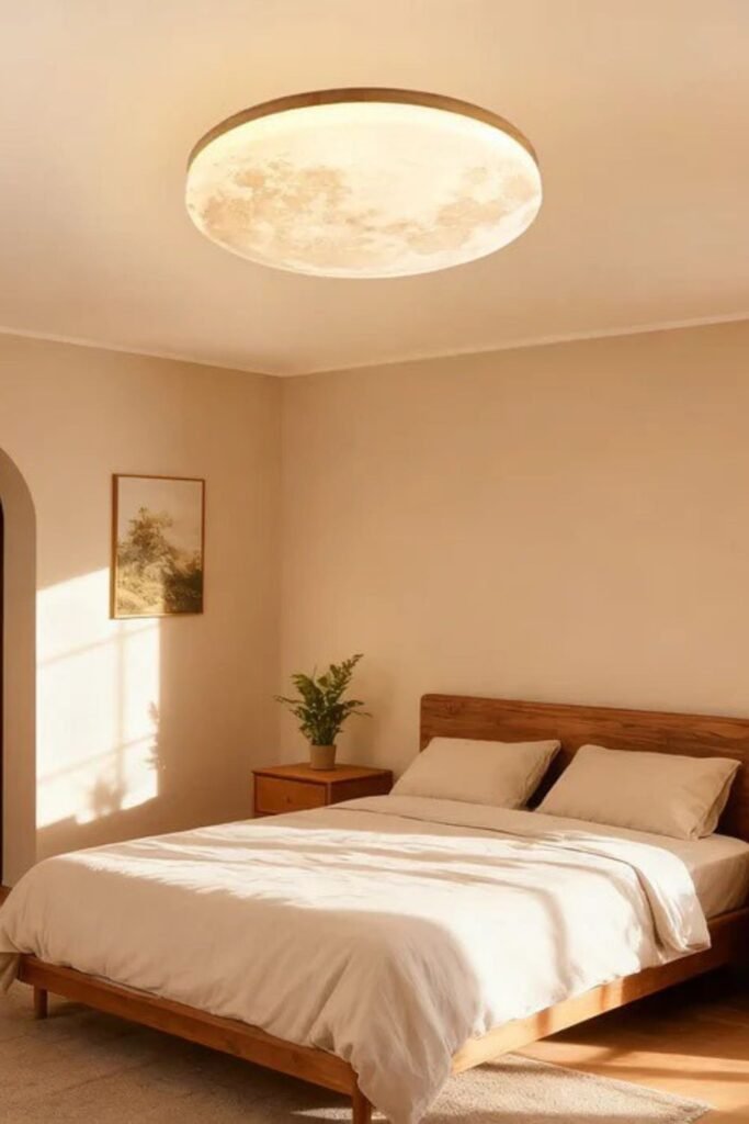 Bedrooms don’t need dramatic fixtures hanging overhead. A soft, flush-mounted disc like this keeps the ceiling clean while creating a calm glow that feels almost like natural light.