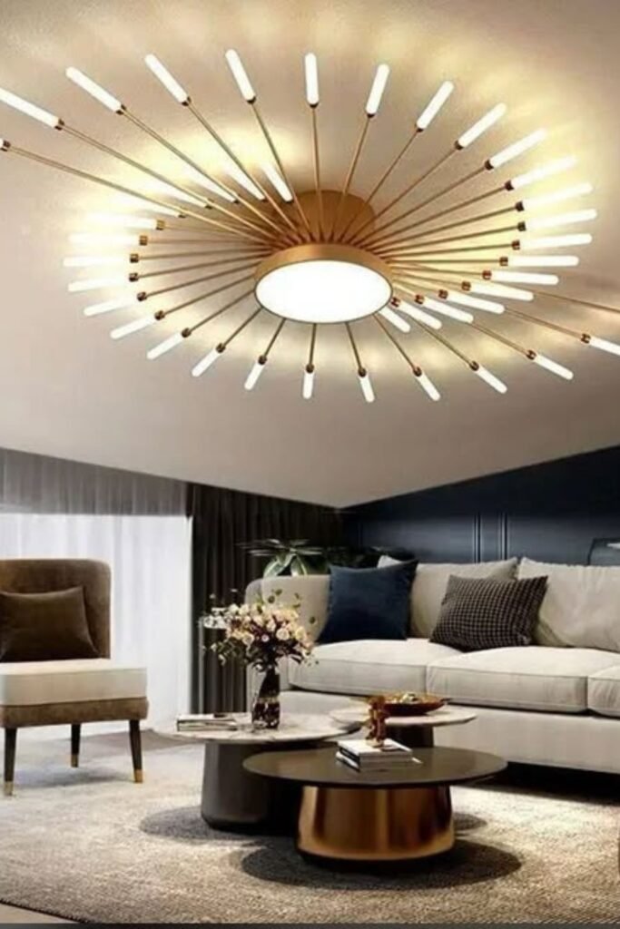 Flat ceilings don’t have to look flat. A wide sunburst fixture like this spreads outward instead of downward, which makes the room feel larger while still delivering serious personality.