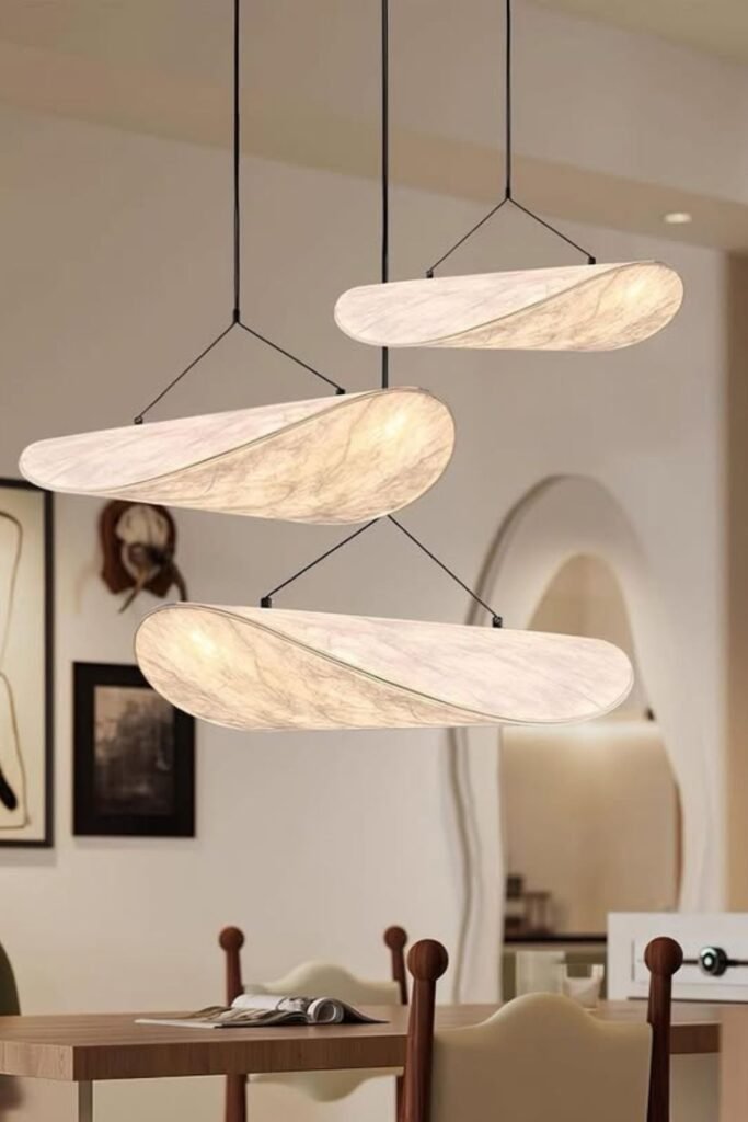 Soft, diffused shades prevent glare and spread light evenly across the surface. Neutral tones and curved furniture pair well with organic shapes like these.