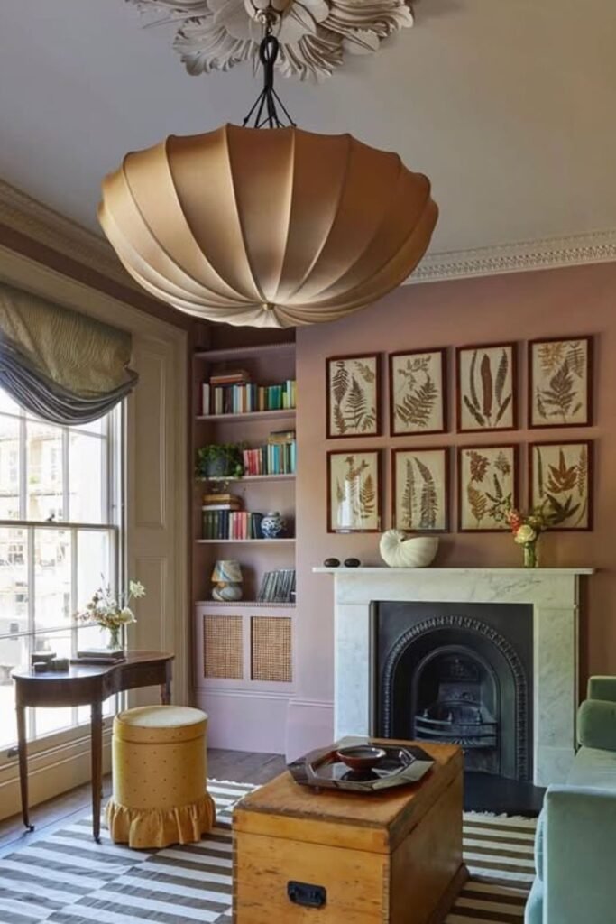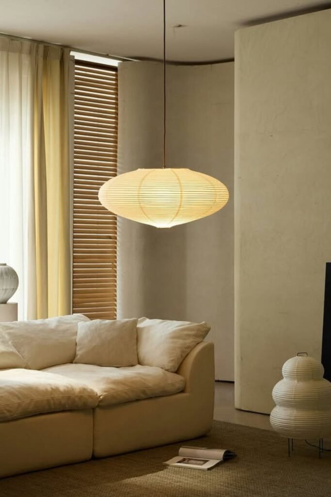 Soft light changes everything. A simple paper-style pendant like this creates a warm, even glow that instantly makes a living room feel relaxed and inviting.