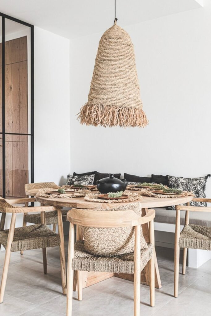 Plain white ceilings can make a dining space feel flat. A woven rattan pendant instantly adds warmth and character without feeling heavy or formal.