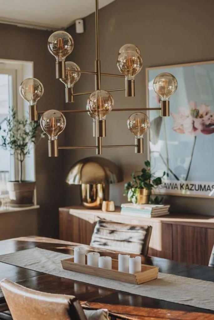 Gold or brass finishes warm up neutral spaces instantly. Pair it with soft furnishings and darker accent walls to create contrast.