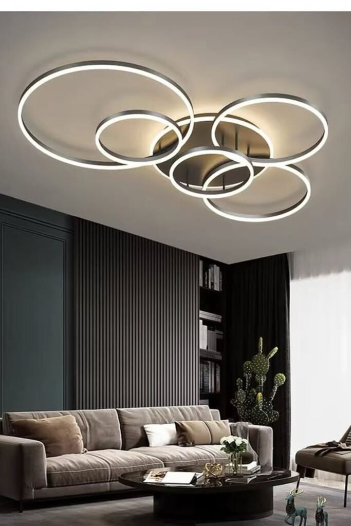 Clean lines like this fit modern, minimalist, or contemporary living rooms. Dark accent walls make the glowing rings stand out even more.