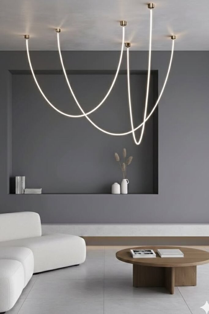 Lighting doesn’t always have to follow straight lines. Flexible LED rope fixtures like this create motion across the ceiling, almost like drawing with light.