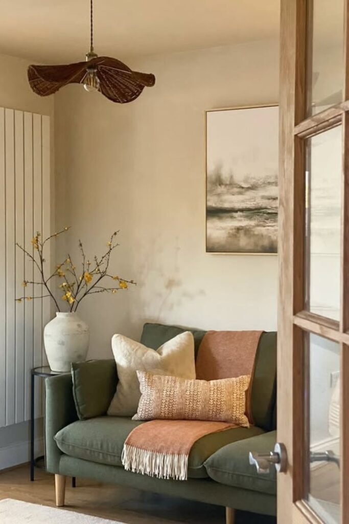 Keep the rest of the palette warm and earthy olive, rust, beige to let the fixture feel intentional instead of random.