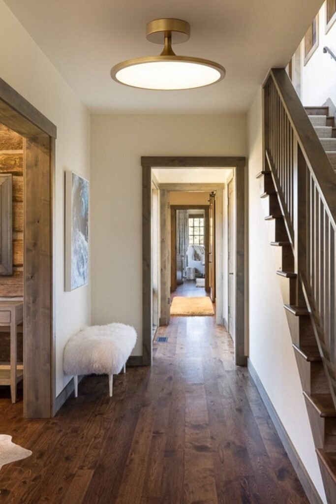 Install it centered in the walkway, not too close to the stairs, so the light feels balanced. Simple shapes work best in transitional spaces where you want brightness without distraction.