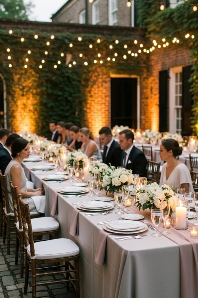 Soft lighting, compact seating, and layered florals help transform the courtyard into a warm, private celebration space.