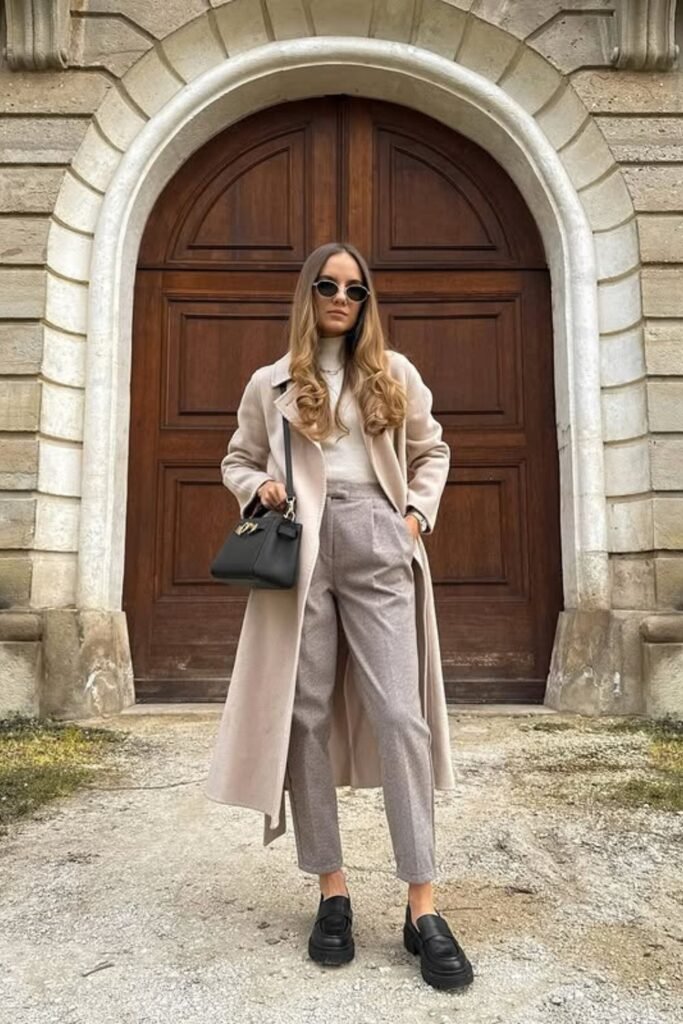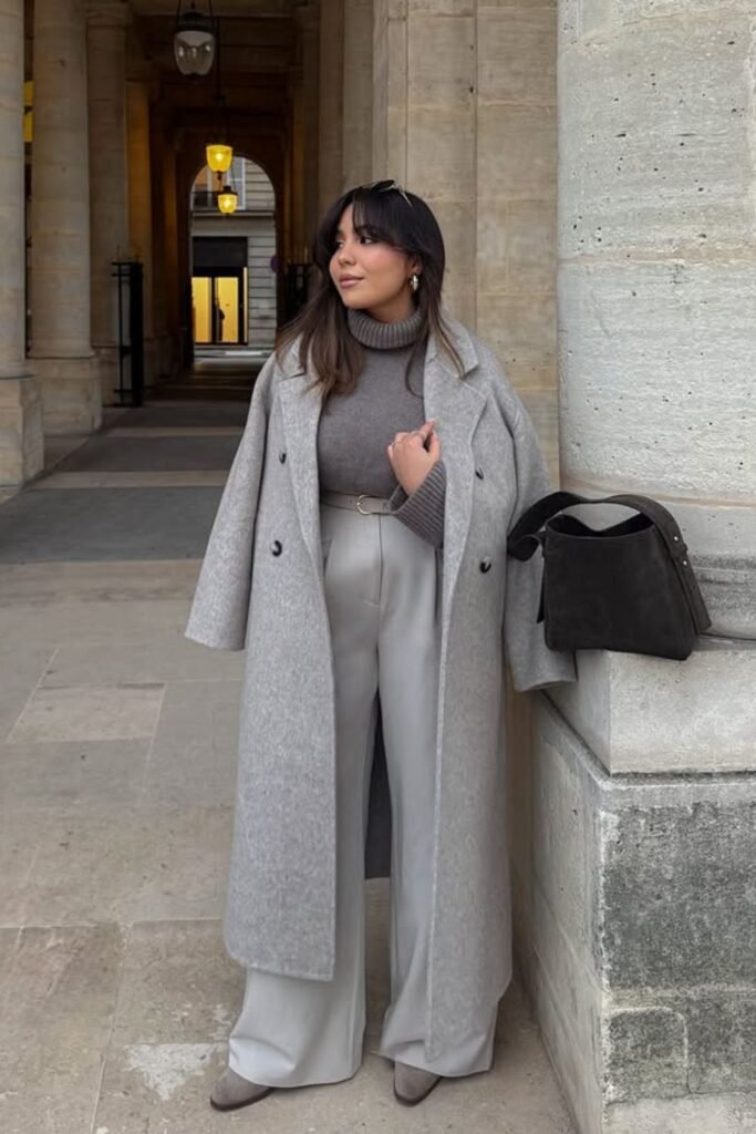Neutral stacking works beautifully when you mix soft shades in the same family. The long gray coat, wide-leg slacks.