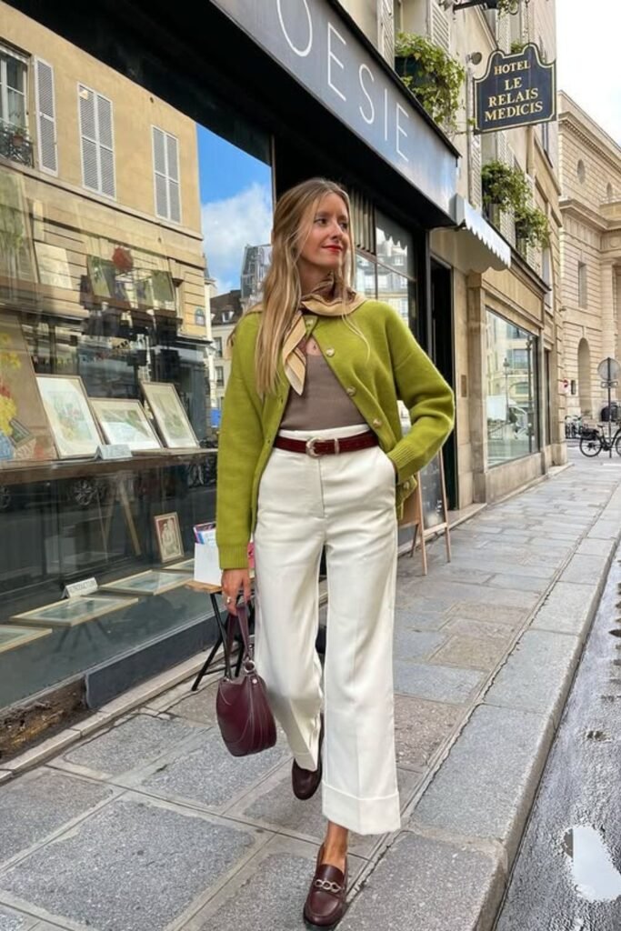 The lime cardigan, scarf, and burgundy accents make it amazing. To do it again, wear white pants with a neutral top and then add a bright accessory to make it stand out.