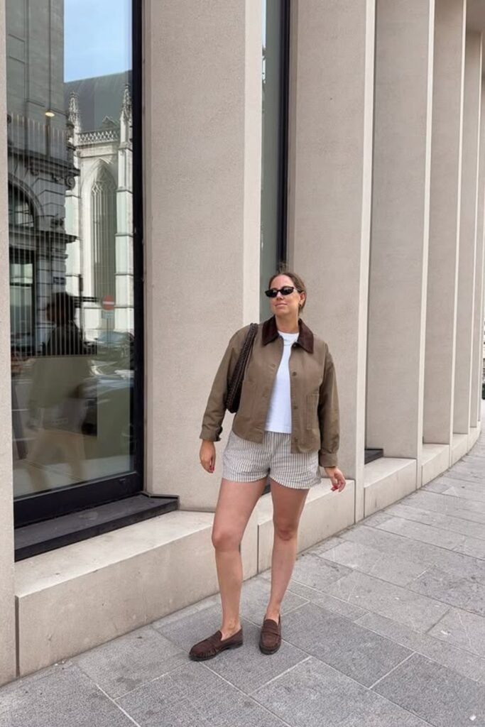 To make it again, start with a simple t-shirt and neutral shorts, then add a light jacket to give it shape.