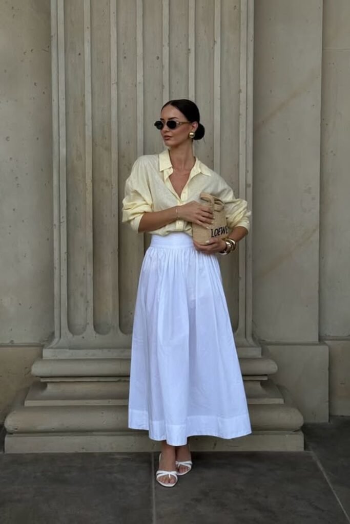 This is great for summer afternoons, lunches in the garden, or vacation days because it has a pale yellow blouse, a white skirt, and basic shoes.