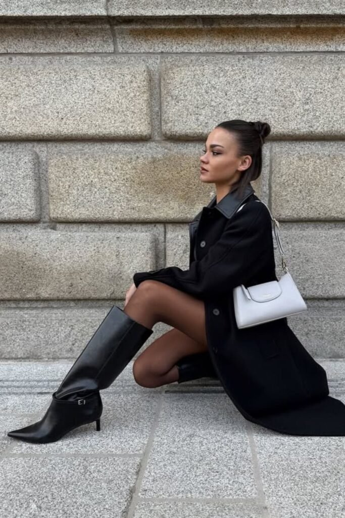 Strong all-black pieces create instant chic when you mix textures the right way. The long coat, elegant boots.