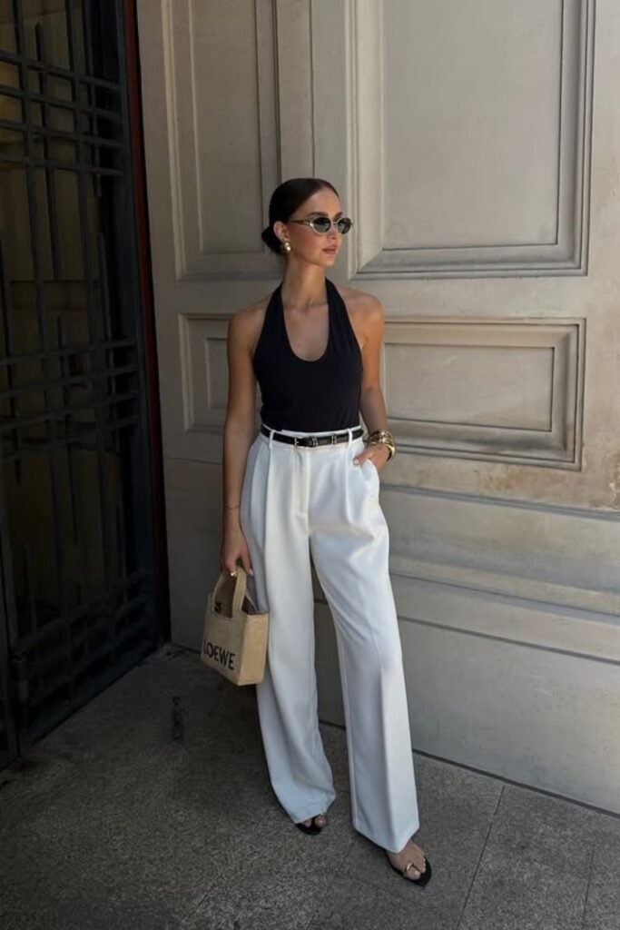 A black halter top and crisp white pants are a great look for warm days, especially if you want a clean, professional base to wear.