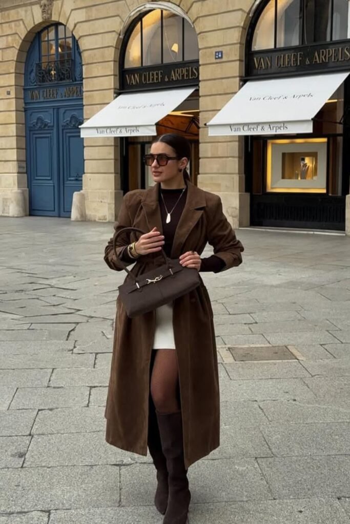 Deep brown tones instantly elevate the cold-weather dressing, especially when you stack them through a knee-high boots, suede trench, and a structured bag.