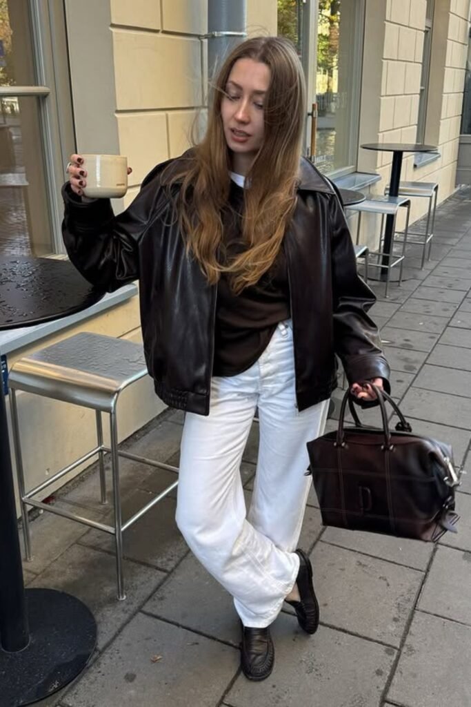 Relaxed pieces feel instantly intentional when you mix crisp white denim with a deep brown leather jacket and matching loafers.