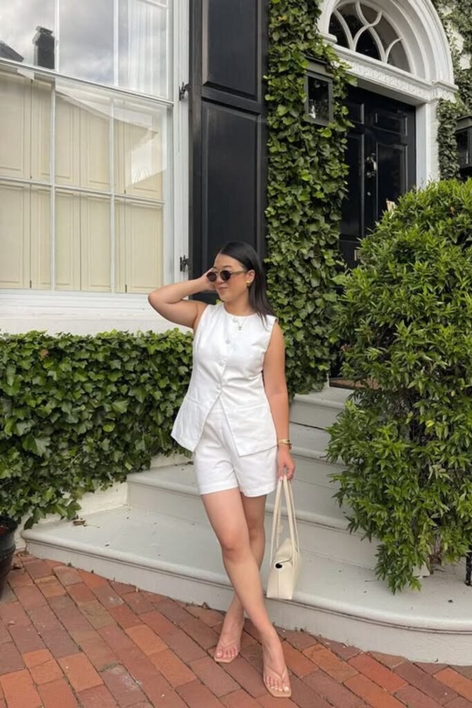Clean, structured white pieces always feel fresh, especially when you blend a sleeveless tailored top with the matching shorts for an easy warm-weather uniform.