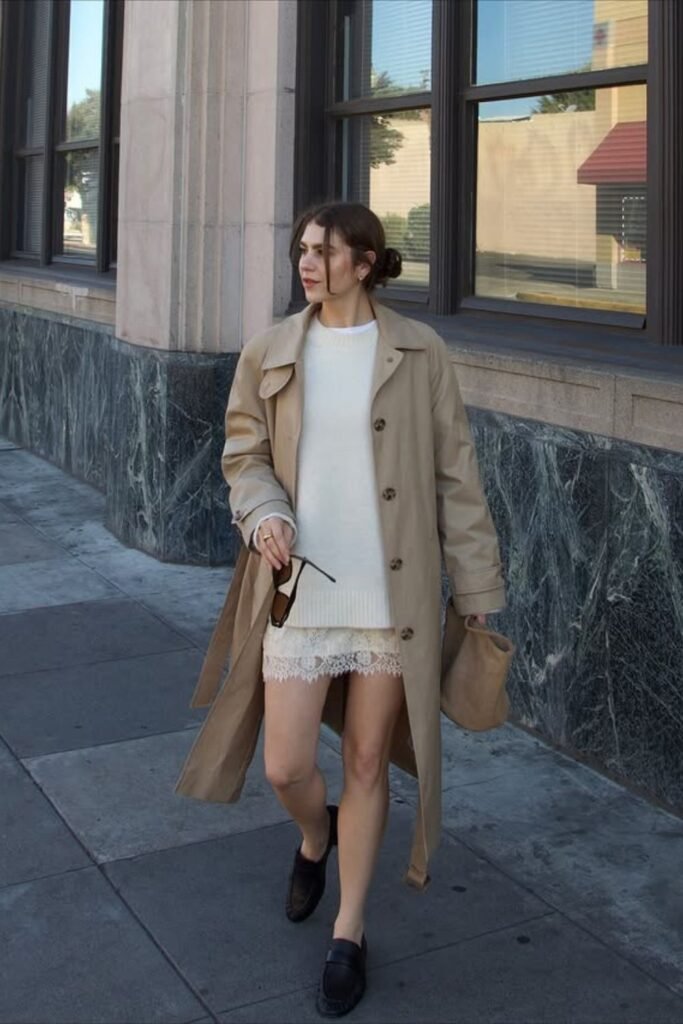 Soft pieces instantly feel elevated when you stack them in warm neutrals, especially with a trench coat balancing and chunky cream sweater and lace-trim mini.