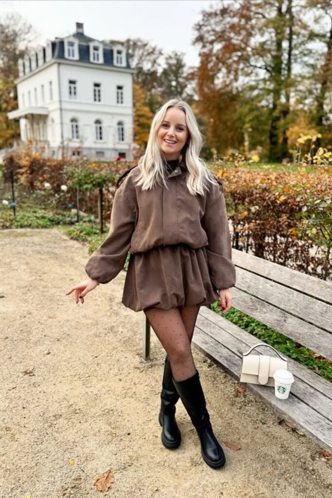 This dress is great for walks in the park, coffee runs, or other casual fall events. It has a flowy brown skirt, sheer tights, and tall boots.