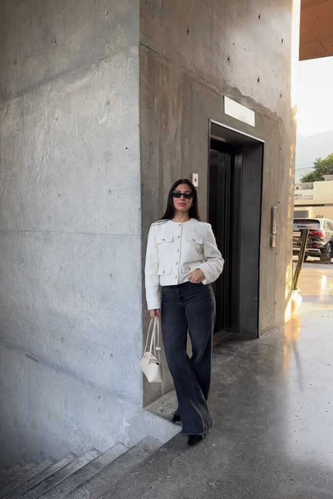 To copy it, wear dark denim with a structured light jacket, and keep the shoes and bag basic so the texture shows out.