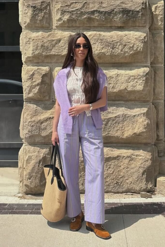 Soft color pieces can make your outfit look chic fast, especially on busy days. The lilac slacks, matching sweater, and light top are great for running errands, going to breakfast.