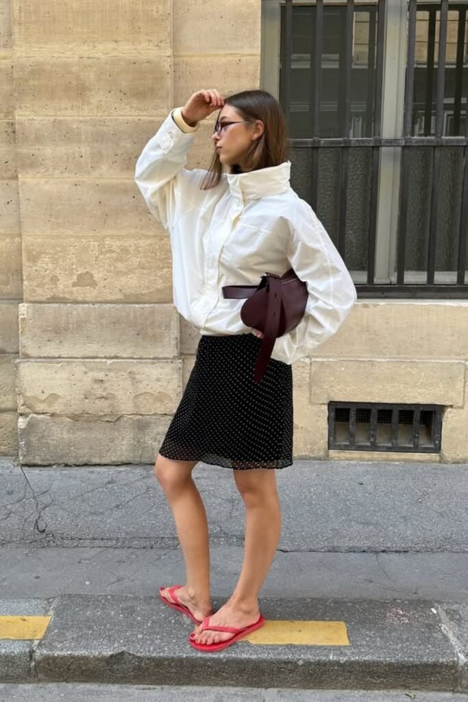 The white jacket, polka-dot skirt, and bright flip-flops make outfit excellent for doing errands or taking a walk in the warm weather.