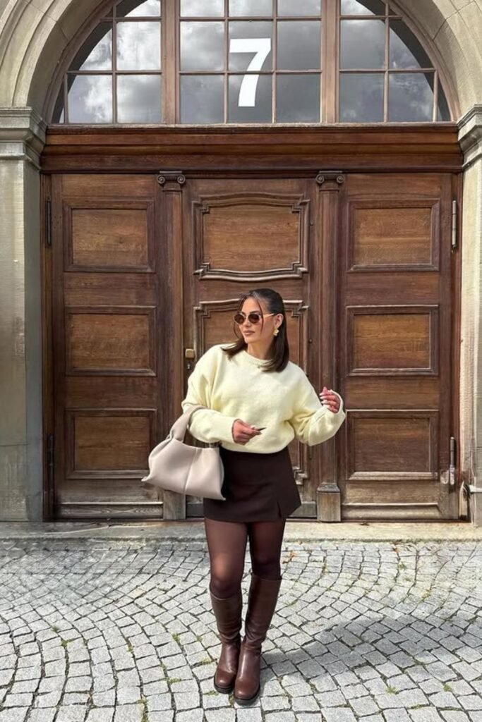 This outfit is perfect for going to get coffee, making plans for the weekend, or when it’s not too cold. It has a cream sweater, a brown skirt, tights, and tall boots.