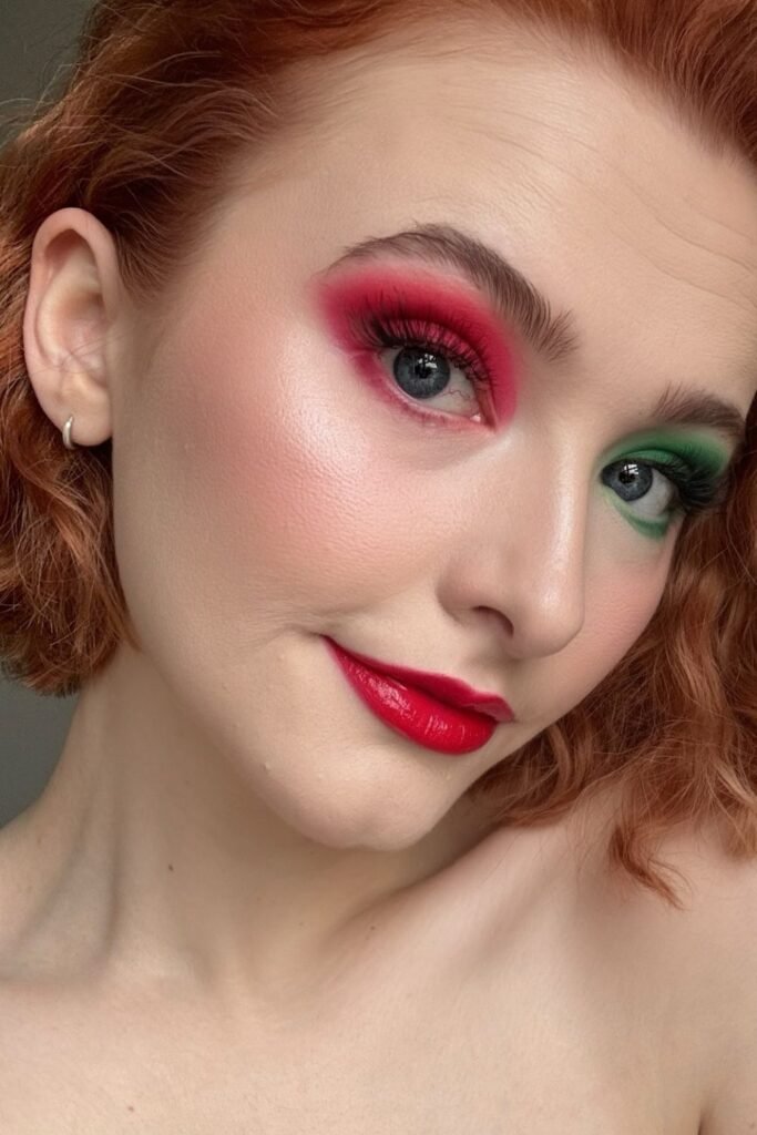Playful and full of Christmas spirit, this makeup is perfect for holiday costume parties or themed gatherings.